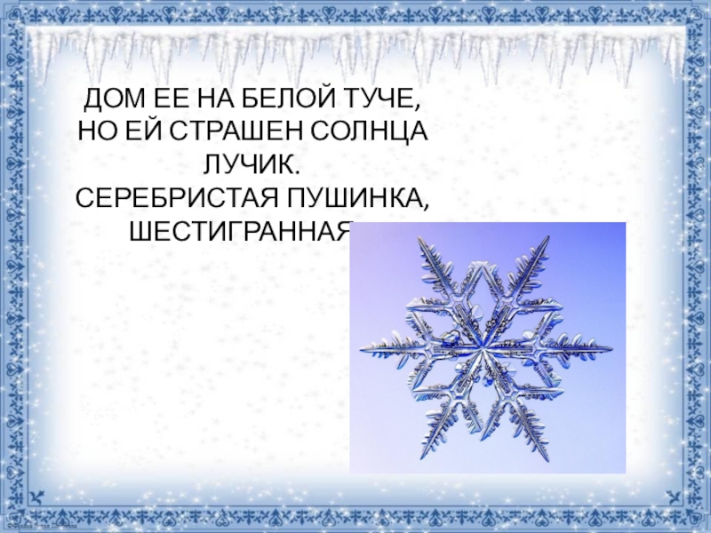 Слайд 8Дом ее на белой туче, Но ей страшен солнца лучик. Серебристая пушинка, Шестигранная...