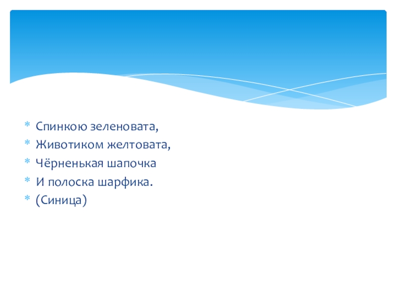 Спинкою зеленовата,Животиком желтовата,Чёрненькая шапочкаИ полоска шарфика.(Синица)