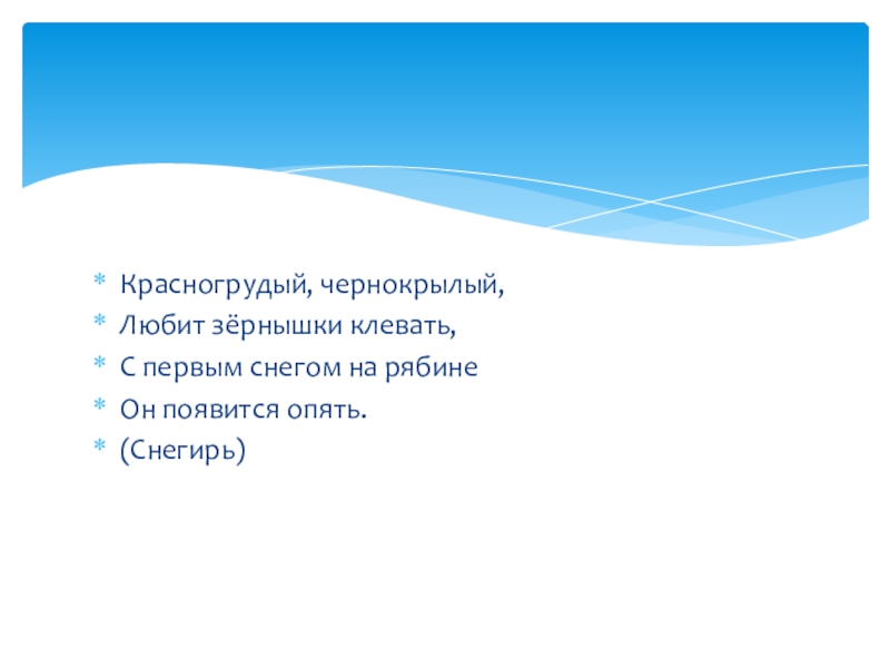 Красногрудый, чернокрылый,Любит зёрнышки клевать,С первым снегом на рябинеОн появится опять.(Снегирь)