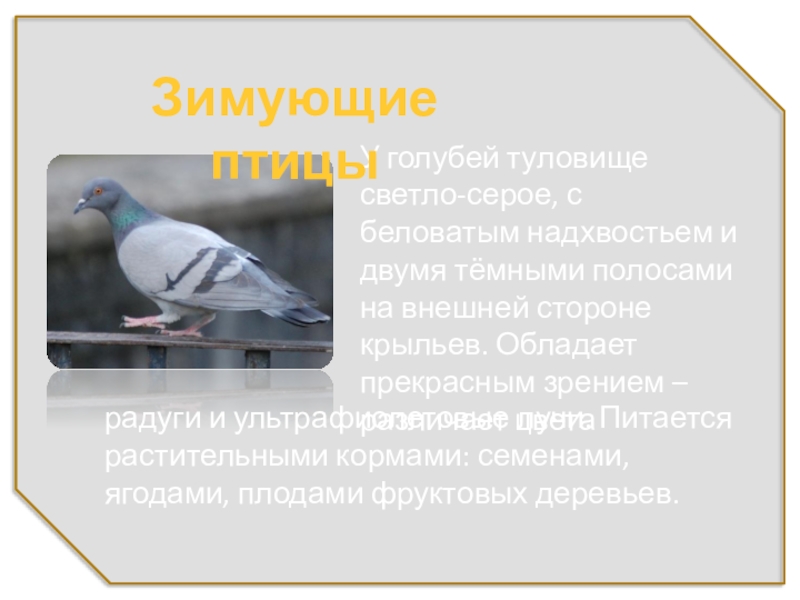 радуги и ультрафиолетовые лучи. Питается растительными кормами: семенами, ягодами, плодами фруктовых деревьев.