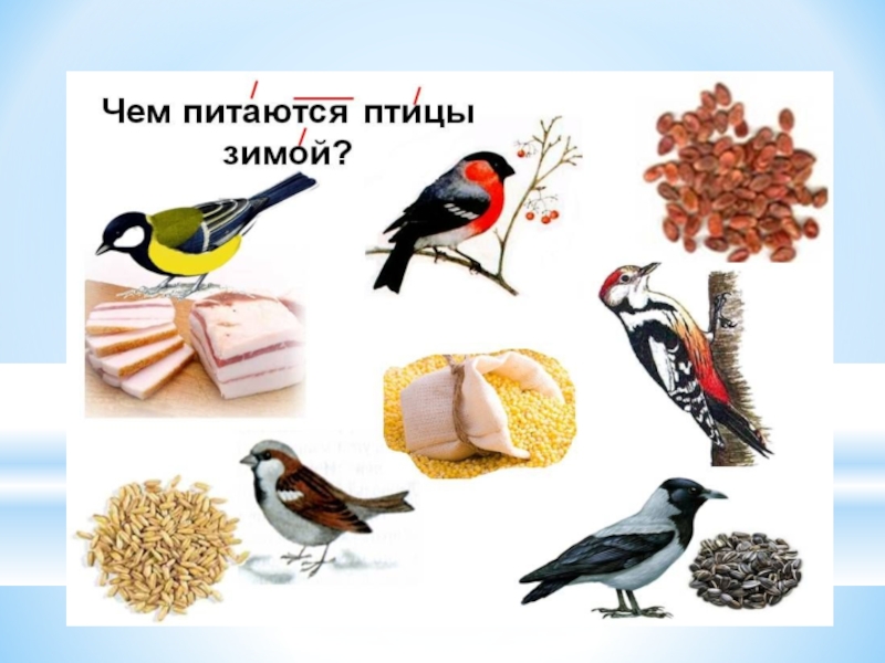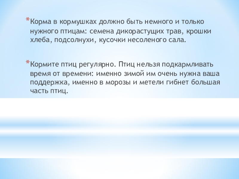 Слайд 7Корма в кормушках должно быть немного и только нужного птицам: семена