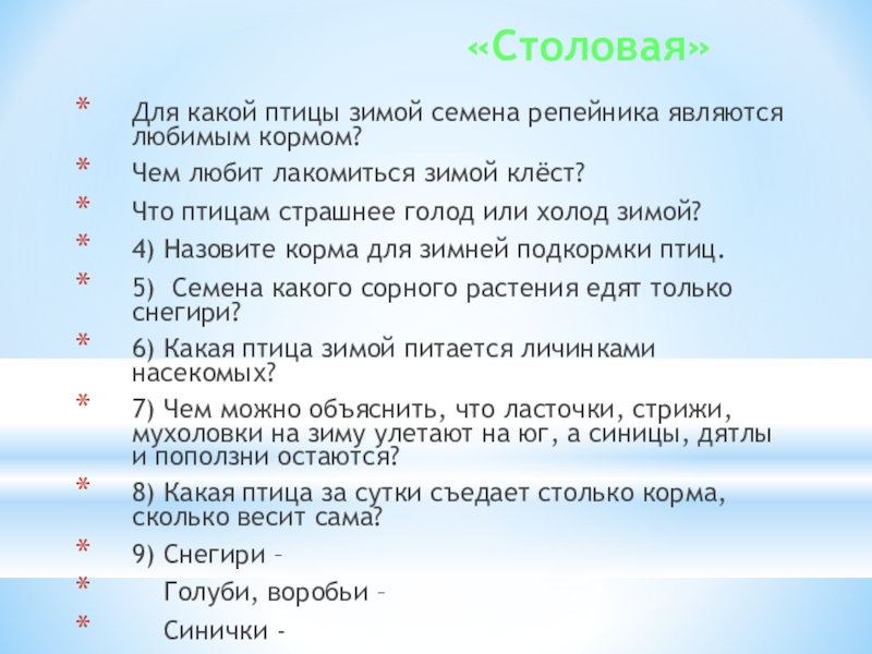 4) Назовите корма для зимней подкормки птиц.
