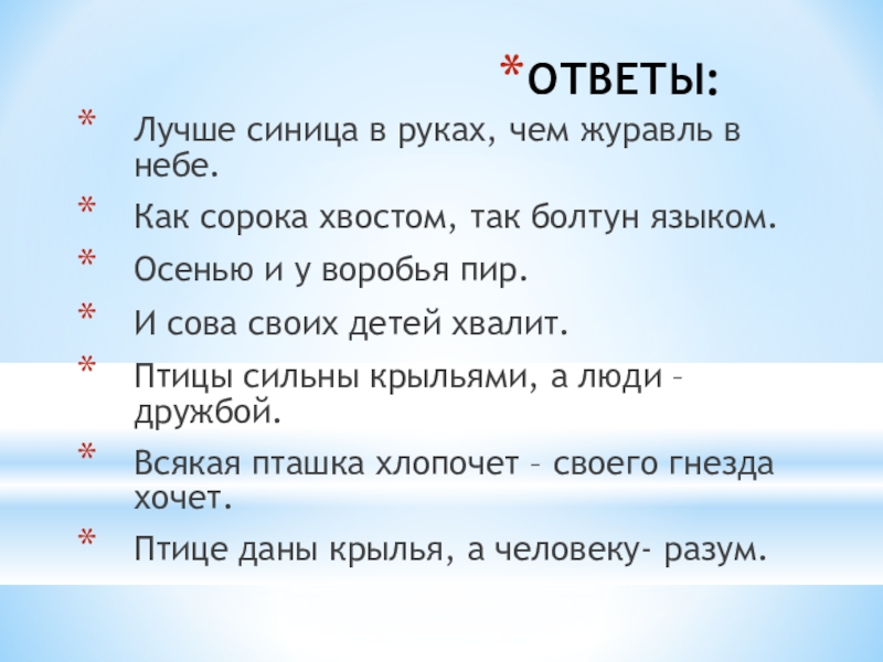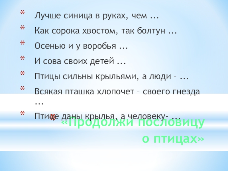 Слайд 31 «Продолжи пословицу о птицах»