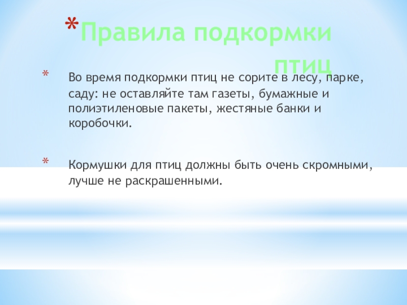 - Во время подкормки птиц не оставляйте газеты, бумагу, полиэтиленовые пакеты, жестяные банки и коробочки.