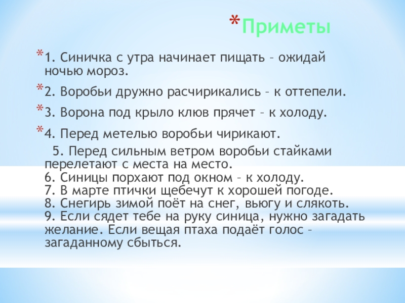1. Синичка с утра начинает пищать – ожидай ночью мороз.