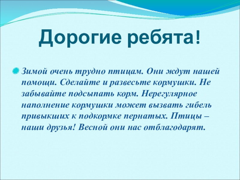Дорогие ребята!  Зимой очень трудно птицам. Они ждут нашей помощи. Сделайте и развесьте кормушки. Не забывайте