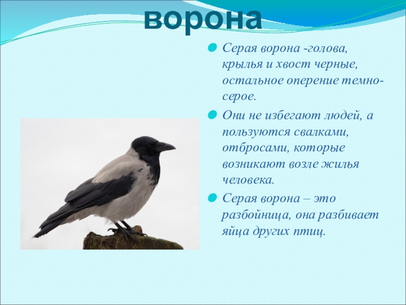 воронаСерая ворона -голова, крылья и хвост черные, остальное оперение темно-серое. Они не избегают людей, а пользуются свалками,