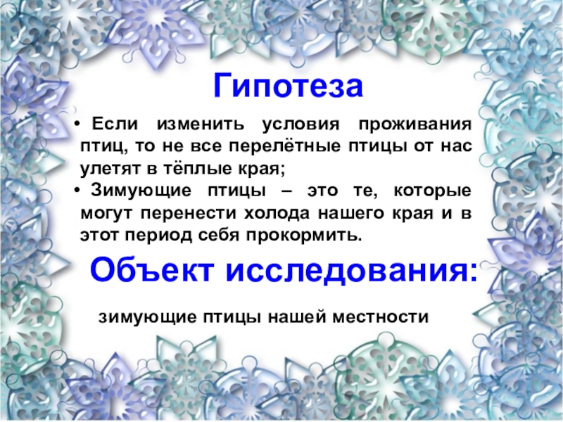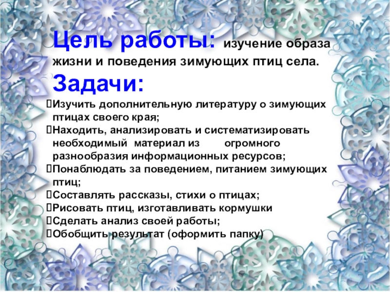 Слайд 4Цель работы: изучение образа жизни и поведения зимующих птиц села.