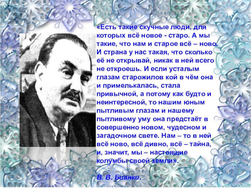мы такие, что нам и старое всё – ново. И страна у нас такая, что сколько её не открывай, никак в ней всего не откроешь. И если усталым глазам старожилов кой в чём она и примелькалась, стала привычной, а потому как будто и неинтересной, то нашим юным пытливым глазам и нашему пытливому уму она предстаёт в совершенно новом, чудесном и загадочном свете. Нам – то в ней всё ново, всё дивно, всё – тайна, и, значит, мы – настоящие колумбы своей земли».