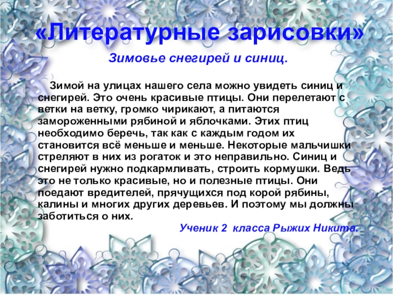 можно увидеть синиц и снегирей. Это очень красивые птицы. Они перелетают с ветки на ветку, громко чирикают, а питаются замороженными рябиной и яблочками. Этих птиц необходимо беречь, так как с каждым годом их становится всё меньше и меньше. Некоторые мальчишки стреляют в них из рогаток и это неправильно. Синиц и снегирей нужно подкармливать, строить кормушки. Ведь это не только красивые, но и полезные птицы. Они поедают вредителей, прячущихся под корой рябины, калины и многих других деревьев. И поэтому мы должны заботиться о них.