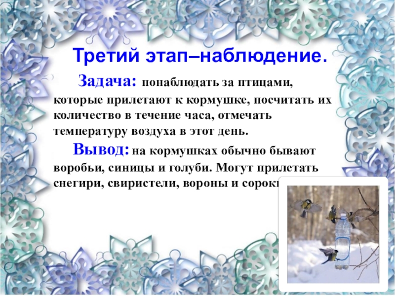 Вывод: на кормушках обычно бывают воробьи, синицы и голуби. Могут прилетать снегири, свиристели, вороны и сороки.