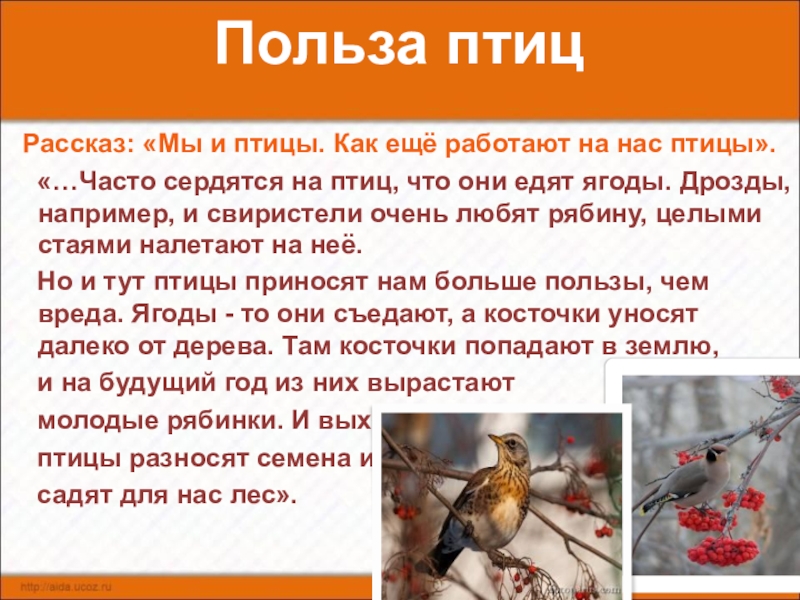 «…Часто сердятся на птиц, что они едят ягоды. Дрозды, например, и свиристели очень любят рябину, целыми стаями налетают на неё.
