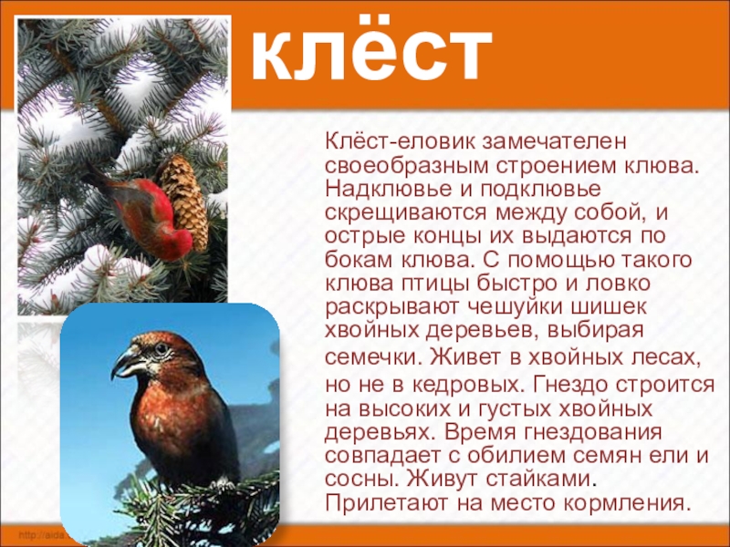 между собой, и острые концы их выдаются по бокам клюва. С помощью такого клюва птицы быстро и ловко раскрывают чешуйки шишек хвойных деревьев, выбирая семечки. Живет в хвойных лесах, но не в кедровых. Гнездо строится на высоких и густых хвойных деревьях. Время гнездования совпадает с обилием семян ели и сосны. Живут стайками. Прилетают на место кормления.