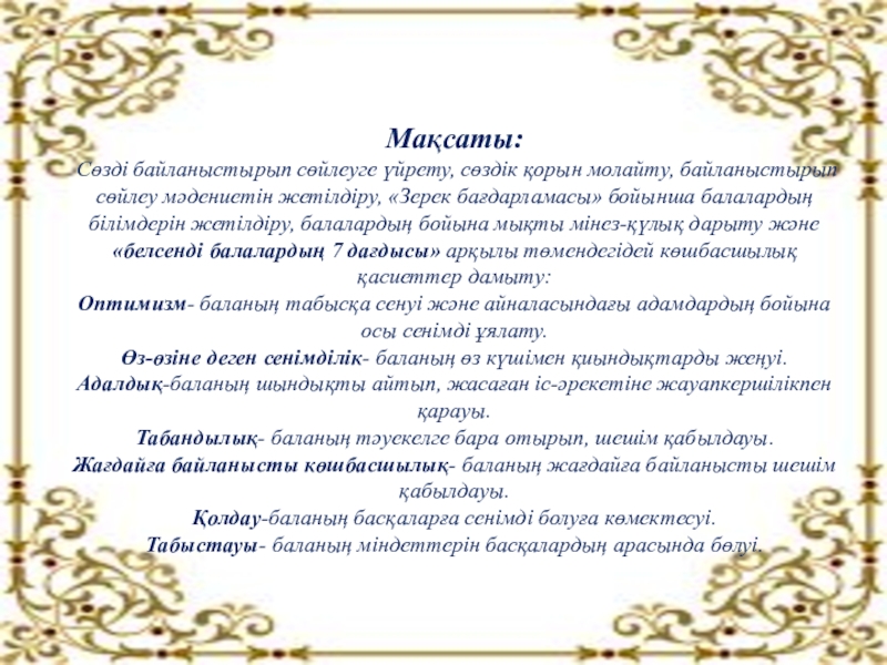 Мақсаты: Сөзді байланыстырып сөйлеуге үйрету, сөздік қорын молайту, байланыстырып сөйлеу мәдениетін жетілдіру, «Зерек бағдарламасы» бойынша балалардың білімдерін жетілдіру, балалардың бойына мықты мінез-қүлық дарыту және «белсенді балалардың 7 дағдысы» арқылы төмендегідей көшбасшылық қасиеттер дамыту: Оптимизм- баланың