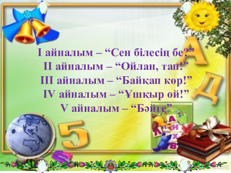 – “Байқап көр!” ІV айналым – “Ұшқыр ой!” V айналым – “Бәйге”