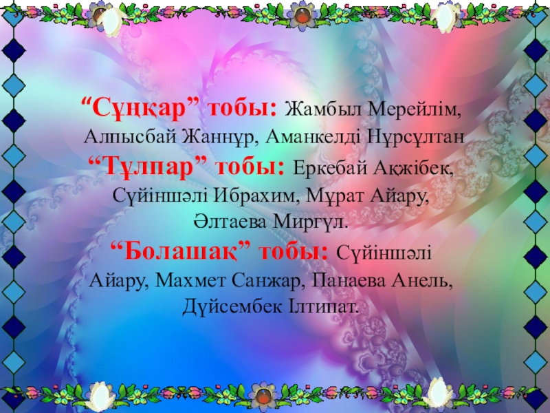 Слайд 3“Сұңқар” тобы: Жамбыл Мерейлім, Алпысбай Жаннұр, Аманкелді Нұрсұлтан  “Тұлпар” тобы: Еркебай Ақжібек,