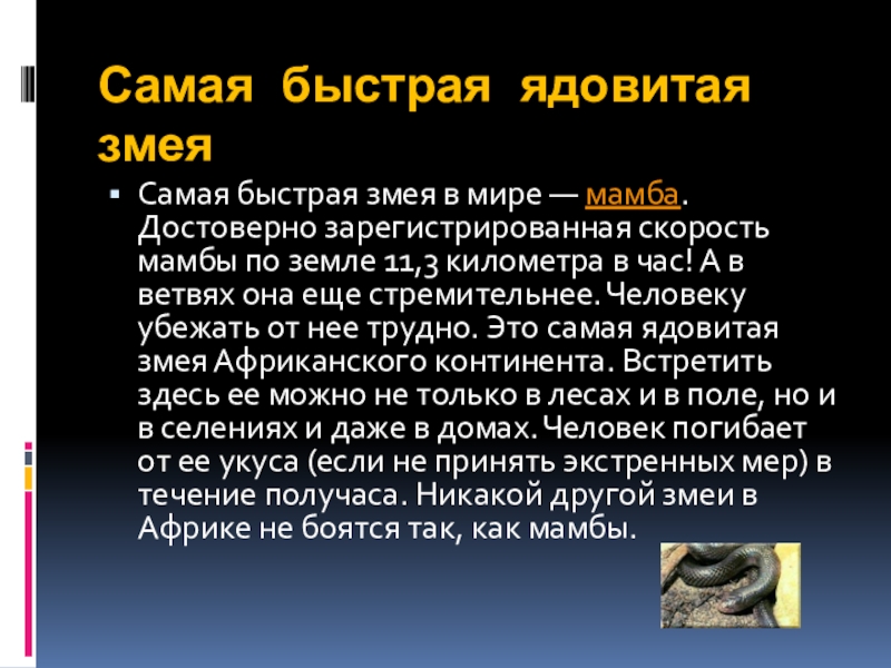 2.Чёрная мамба - самая быстрая змея. Она может развивать скорость свыше 20 км/ч.