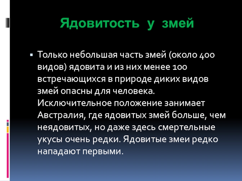 из них менее 100 встречающихся в природе диких видов змей опасны для человека. Исключительное положение занимает Австралия, где ядовитых змей больше, чем неядовитых, но даже здесь смертельные укусы очень редки. Ядовитые змеи редко нападают первыми.