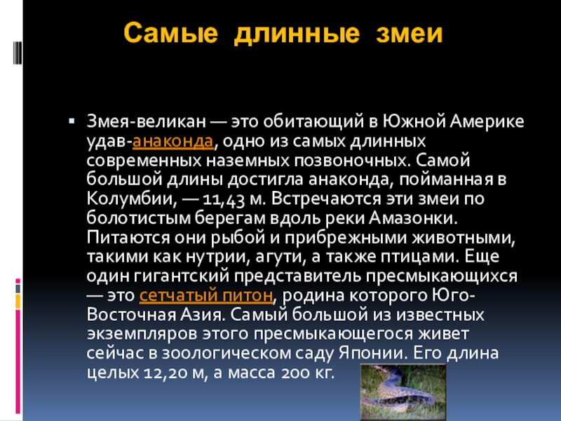 из самых длинных современных наземных позвоночных. Самой большой длины достигла анаконда, пойманная в Колумбии, — 11,43 м. Встречаются эти змеи по болотистым берегам вдоль реки Амазонки. Питаются они рыбой и прибрежными животными, такими как нутрии, агути, а также птицами. Еще один гигантский представитель пресмыкающихся — это сетчатый питон, родина которого Юго-Восточная Азия. Самый большой из известных экземпляров этого пресмыкающегося живет сейчас в зоологическом саду Японии. Его длина целых 12,20 м, а масса 200 кг.