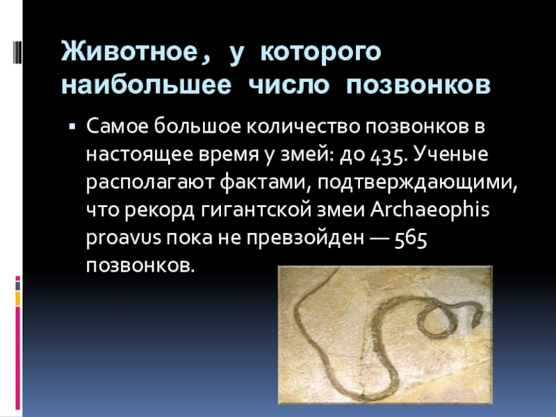 Слайд 18Животное, у которого наибольшее число позвонков
