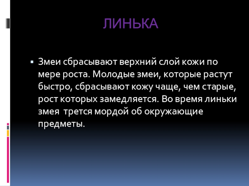 растут быстро, сбрасывают кожу чаще, чем старые, рост которых замедляется. Во время линьки змея трется мордой об окружающие предметы.