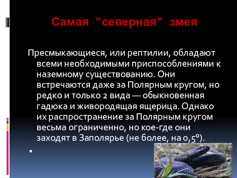 существованию. Они встречаются даже за Полярным кругом, но редко и только 2 вида — обыкновенная гадюка и живородящая ящерица. Однако их распространение за Полярным кругом весьма ограниченно, но кое-где они заходят в Заполярье (не более, на 0,5°).