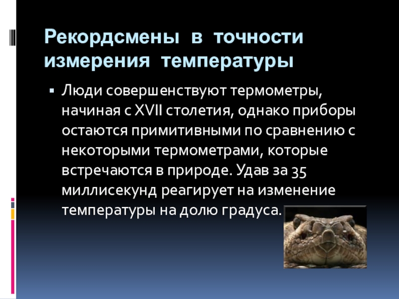 однако приборы остаются примитивными по сравнению с некоторыми термометрами, которые встречаются в природе. Удав за 35 миллисекунд реагирует на изменение температуры на долю градуса.