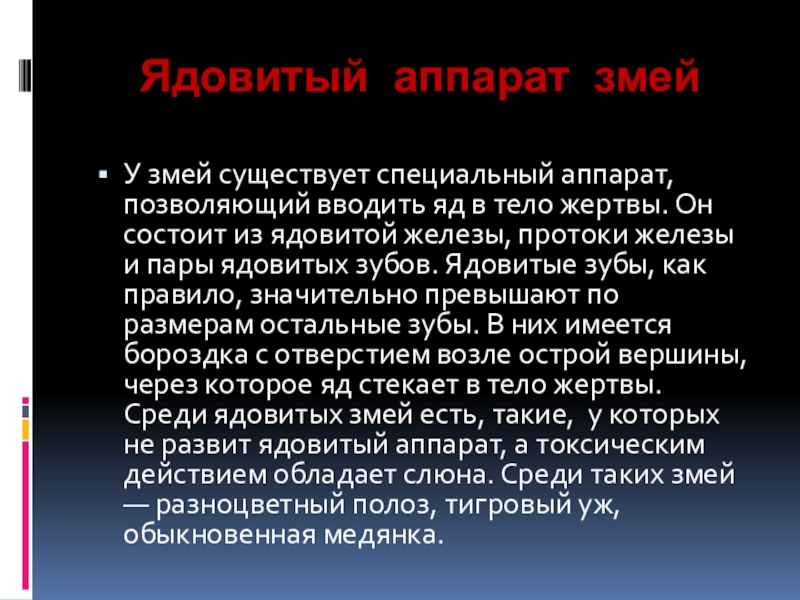 тело жертвы. Он состоит из ядовитой железы, протоки железы и пары ядовитых зубов. Ядовитые зубы, как правило, значительно превышают по размерам остальные зубы. В них имеется бороздка с отверстием возле острой вершины, через которое яд стекает в тело жертвы. Среди ядовитых змей есть, такие, у которых не развит ядовитый аппарат, а токсическим действием обладает слюна. Среди таких змей — разноцветный полоз, тигровый уж, обыкновенная медянка.