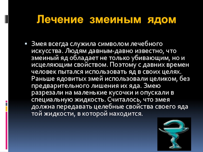 что змеиный яд обладает не только убивающим, но и исцеляющим свойством. Поэтому с давних времен человек пытался использовать яд в своих целях. Раньше ядовитых змей использовали целиком, без предварительного лишения их яда. Змею разрезали на маленькие кусочки и опускали в специальную жидкость. Считалось, что змея должна передавать целебные свойства своего яда той жидкости, в которой находится.