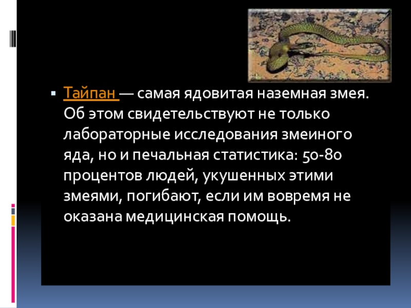 Самая ядовитая наземная змея - австралийский континентальный тайпан. Тайпан может кусать человека до 8 раз и не пускаться в бегство.