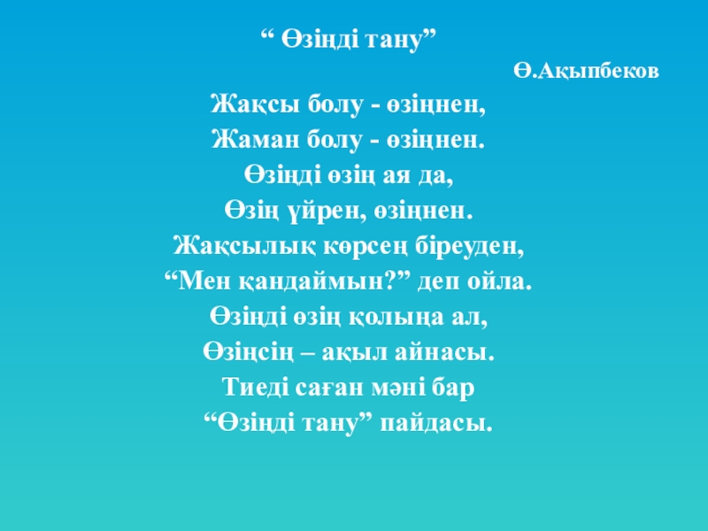 “ Өзіңді тану”Ө.АқыпбековЖақсы болу - өзіңнен,Жаман болу - өзіңнен.Өзіңді өзің ая да,Өзің үйрен, өзіңнен.Жақсылық көрсең біреуден,“Мен қандаймын?” деп ойла.Өзіңді өзің қолыңа ал,Өзіңсің – ақыл айнасы. Тиеді саған мәні бар“Өзіңді тану” пайдасы.