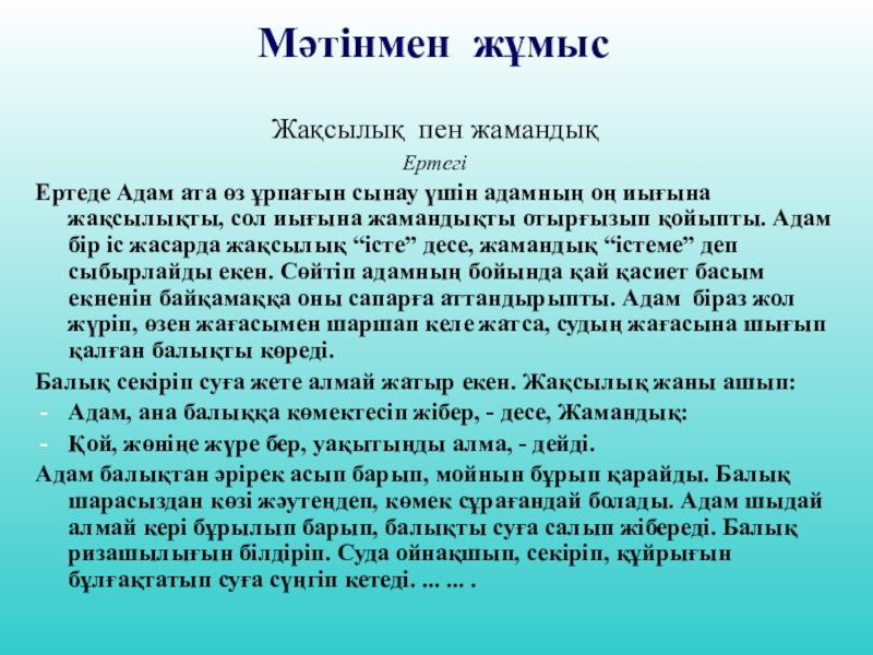 Мәтінмен жұмысЖақсылық пен жамандық  ЕртегіЕртеде Адам ата өз ұрпағын сынау үшін адамның оң иығына жақсылықты, сол