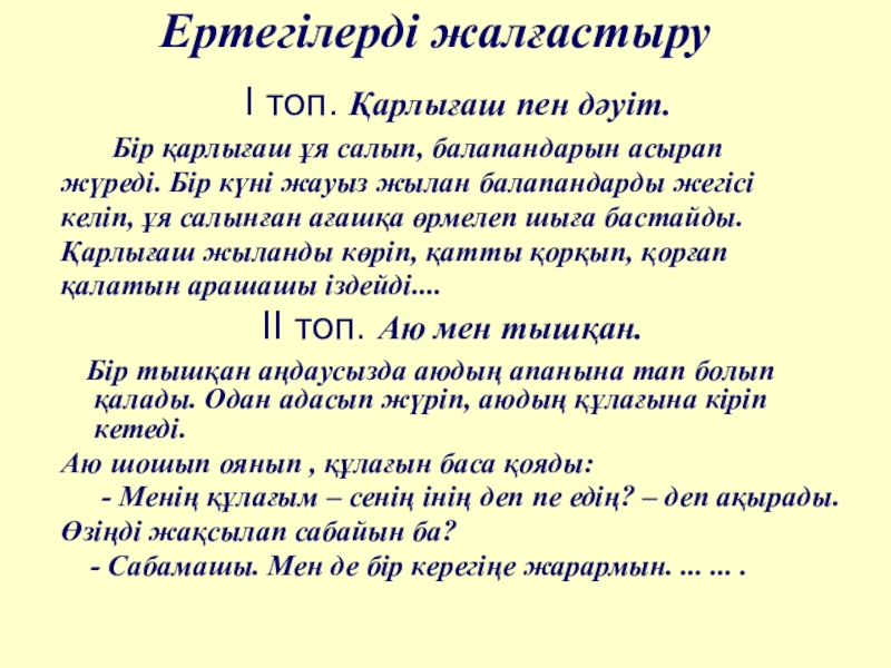 Ертегілерді жалғастыру I топ. Қарлығаш пен дәуіт.    Бір қарлығаш ұя салып, балапандарын асырапжүреді. Бір