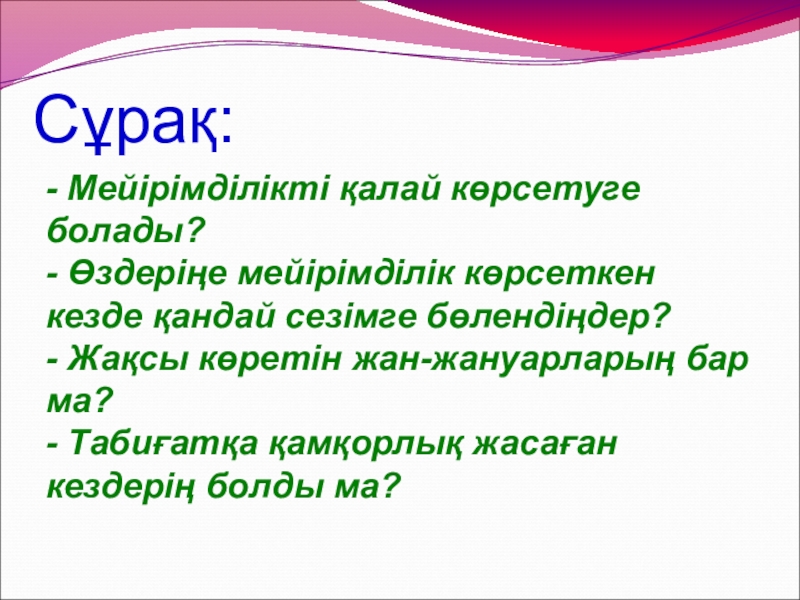 Сұрақ:- Мейірімділікті қалай көрсетуге болады? - Өздеріңе мейірімділік көрсеткен кезде қандай сезімге бөлендіңдер? - Жақсы көретін жан-жануарларың