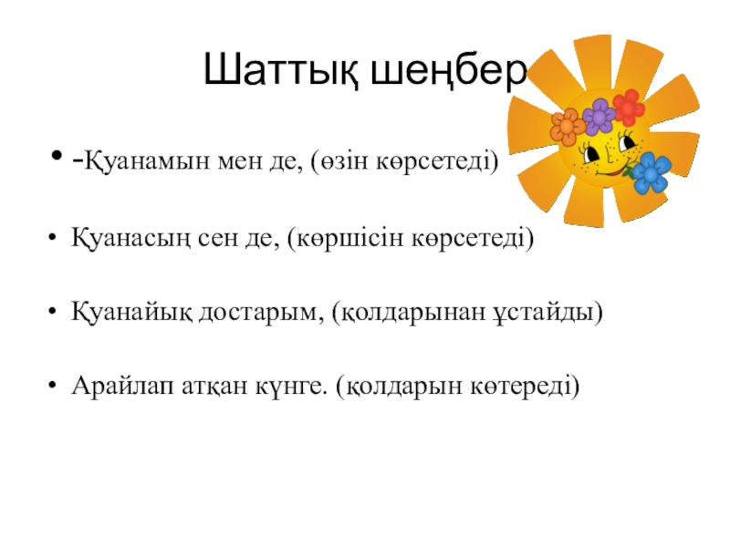 Шаттық шеңбер-Қуанамын мен де, (өзін көрсетеді)Қуанасың сен де, (көршісін көрсетеді)Қуанайық достарым, (қолдарынан ұстайды)Арайлап атқан күнге. (қолдарын көтереді)