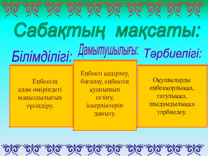 Еңбекті қадірлеу, бағалау, еңбектің қуанышын сезіну, іскерліктерін дамыту.