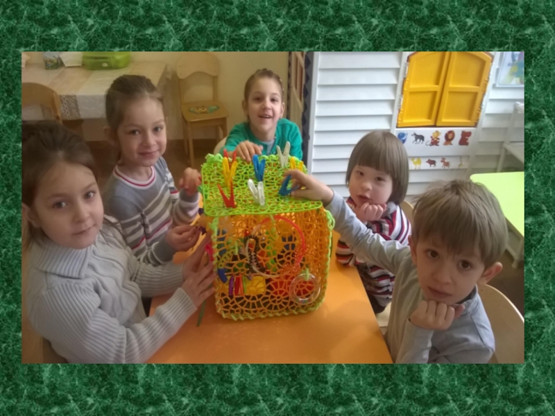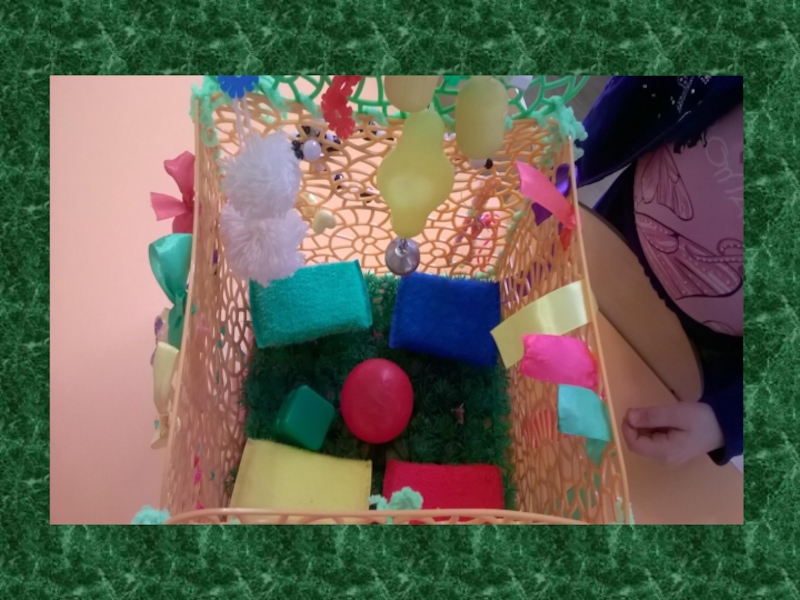 Куб изготавливала из шести решеток для раковины , соединенных при помощи ниток . Внутрь куба положила пластмассовые шары , на верхнюю плоскость повесить колокольчики различные по звучанию. На внешних сторонах и ребрах куба разместила ленточки, веревки , коробочки от киндер- сюрпризов, скрепки, банковские резинки, металлическую пластинку с магнитами, пустую катушку из — под ниток.