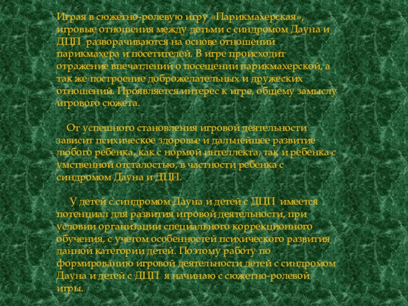 Дауна и ДЦП разворачиваются на основе отношений парикмахера и посетителей. В игре происходит отражение впечатлений о посещении парикмахерской, а так же построение доброжелательных и дружеских отношений. Проявляется интерес к игре, общему замыслу игрового сюжета.