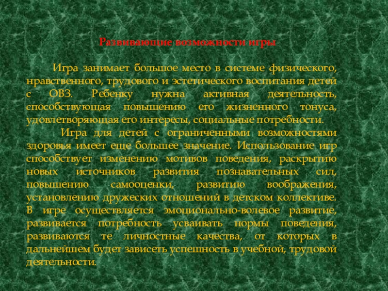 Игра для детей с ограниченными возможностями здоровья имеет еще большее значение. Использование игр способствует изменению мотивов поведения, раскрытию новых источников развития познавательных сил, повышению самооценки, развитию воображения, установлению дружеских отношений в детском коллективе. В игре осуществляется эмоционально-волевое развитие, развивается потребность усваивать нормы поведения, развиваются те личностные качества, от которых в дальнейшем будет зависеть успешность в учебной, трудовой деятельности.