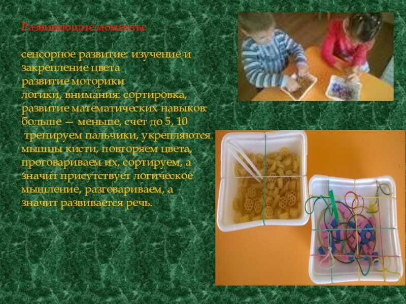 тренируем пальчики, укрепляются мышцы кисти, повторяем цвета, проговариваем их, сортируем, а значит присутствует логическое мышление, разговариваем, а значит развивается речь.