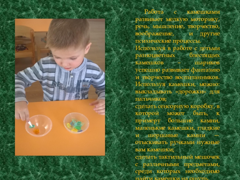 Слайд 36 Работа с камешками развивает мелкую моторику, речь, мышление, творчество, воображение,