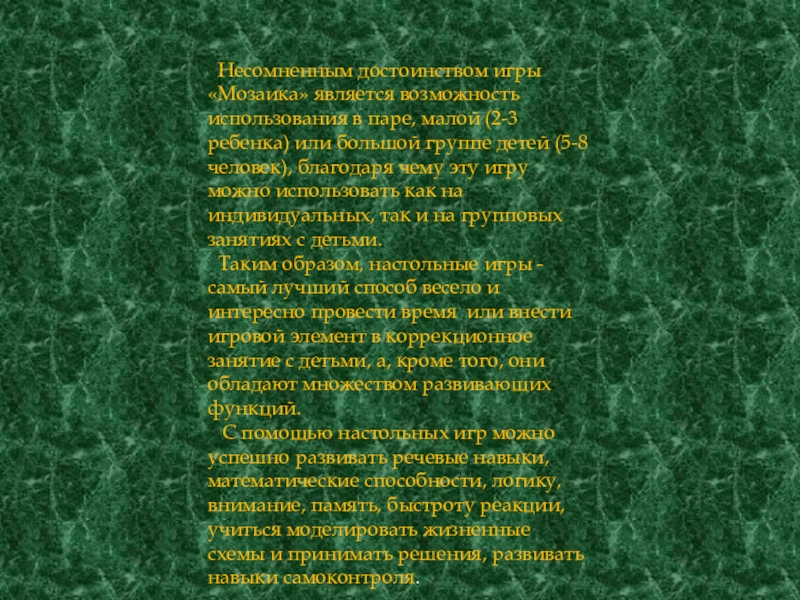 Слайд 18 Несомненным достоинством игры «Мозаика» является возможность использования в паре, малой
