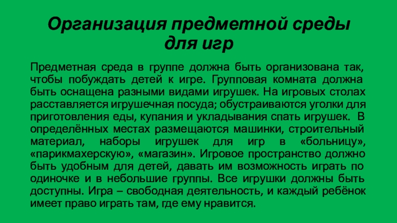 Организация предметной среды для игрПредметная среда в группе должна быть организована так, чтобы побуждать детей к игре.