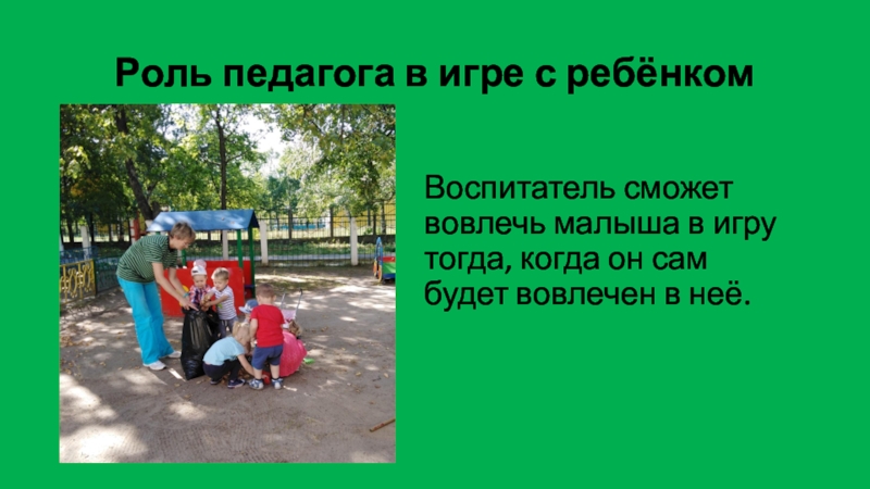 Роль педагога в игре с ребёнкомВоспитатель сможет вовлечь малыша в игру тогда, когда он сам будет вовлечен