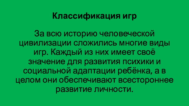 Классификация игрЗа всю историю человеческой цивилизации сложились многие виды игр. Каждый из них имеет своё значение для
