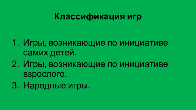 Классификация игрИгры, возникающие по инициативе самих детей.Игры, возникающие по инициативе взрослого.Народные игры.