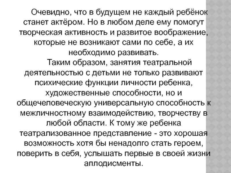 Слайд 8Очевидно, что в будущем не каждый ребёнок станет актёром. Но в