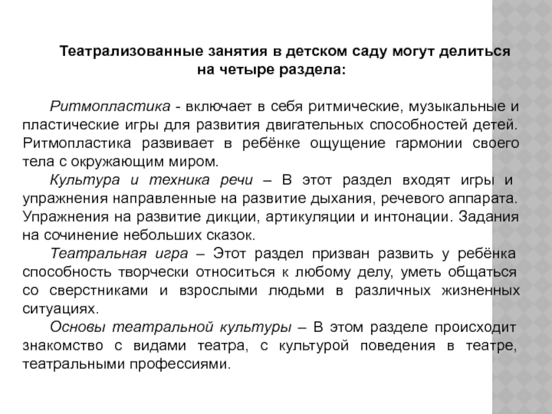 Слайд 4Театрализованные занятия в детском саду могут делиться на четыре раздела:
