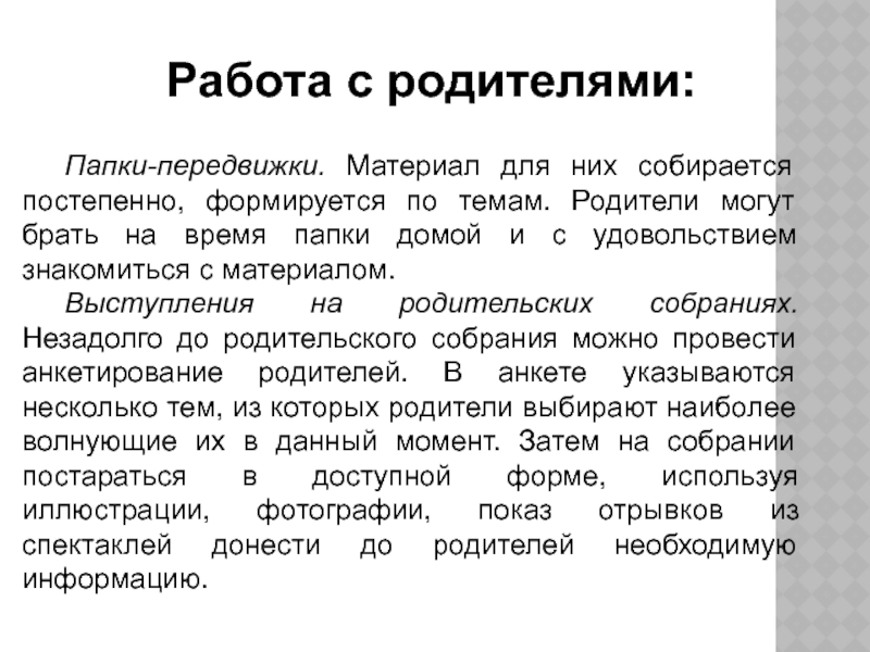 Выступления на родительских собраниях. Незадолго до родительского собрания можно провести анкетирование родителей. В анкете указываются несколько тем, из которых родители выбирают наиболее волнующие их в данный момент. Затем на собрании постараться в доступной форме, используя иллюстрации, фотографии, показ отрывков из спектаклей донести до родителей необходимую информацию.