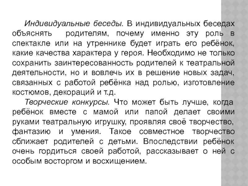 Слайд 7Индивидуальные беседы. В индивидуальных беседах объяснять родителям, почему именно эту роль